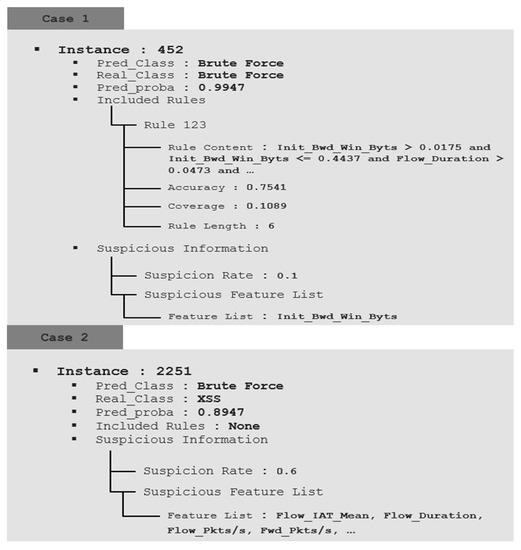 This part proves through real examples that the proposed method can provide a better explanation and improve interpretation compared to the existing system. Figure 7 provides information and explanation functions for detection data by applying the proposed method. It provides a new interpretation perspective that includes the two explanations above. As the actual monitoring environment is an unlabeled environment, it is interpreted without considering the actual results. Case 1 was not statistically suspicious, and the system predicted brute force with a probability of 0.9947. It also describes the consequences of system prediction, including rule 123, which accounts for brute force. Through analysis by the analyst using such information, it is finally determined that the behavior of the instance is a brute force attack. This is interpreted in relation to the predicted probability and provides the foundation for the final labeling in this process. Case 2 predicted a brute force attack with a high probability of 0.8947. However, as the suspicion rate is calculated as high as 0.6 without any rule explaining the internal process, the analyst can determine that the prediction of the AI is wrong and can track the error of the AI. Case 3 is an instance that needs review because the suspicion rate is calculated as 0.4, and the prediction probability is also low at 0.3495, so it can be predicted that there was an AI judgment error. However, Case 3, in contrast with Case 2, includes one of the representative rules. When analyzed in detail referring to the included Rule, it corresponds to the condition of the Rule that describes the normal characteristics of the training data. Therefore, the analyst expects it to be a normal class and reviews its instance.