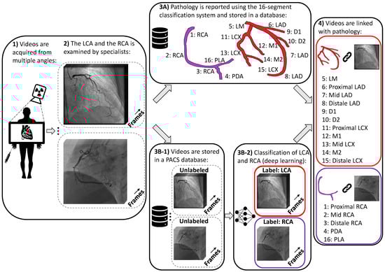 Overview of the proposed framework for linking CAGs and reported pathology. (1) Videos are recorded from various angles. (2) Videos are examined by specialists. (3A) Pathology is reported in a database. (3B-1) Videos are stored, but there is no information about which videos contain LCA or RCA. (3B-2) Classification of LCA and RCA is performed using deep learning (the models presented in this paper). (4) Videos are merged with databases containing pathological findings.