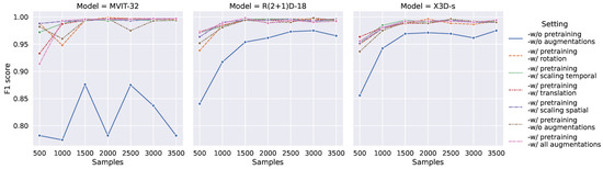 To show the performance achieved with different dataset sizes, we evaluated the performance with various sample sizes. As seen in Figure 2, high F1 scores can be achieved with few samples. For instance, approximately 1500 samples gave an F1 score of 0.99 using all three models. In general, we see a performance increase for all models using pretrained weights. We also noticed that the performance of MVIT-B-32-3 experiments without pretrained weights did not exceed F1 scores greater than 0.90, indicating that pretraining was necessary to obtain a satisfactory performance. This was not the case for R(2+1)D-18 and X3D-S (F1 > 0.95) when training with more than 1500 samples. Interestingly, data augmentation did not improve performance much despite increasing the number of training samples.