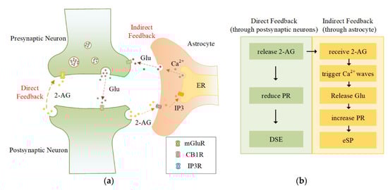 Astrocytes can encapsulate more than 105 synapses and closely link to adjacent neurons, thereby regulating the action patterns of neurons [23,24]. The mechanism of interaction between astrocytes and CPG neurons is provided in Figure 1. When an action potential is delivered to the presynaptic terminal, it stimulates the presynaptic neuron to release glutamate, causing the postsynaptic neuron to depolarize. Subsequently, 2-arachidene glycerol (2-AG) is synthesized and released from the postsynaptic neuron. Since there are 2-AG receptors on both the presynaptic terminal and astrocytes, there are two feedback pathways of 2-AG. The first is direct feedback: part of the 2-AG binds directly to the receptors on the presynaptic terminal, causing a decrease in the synaptic transmission PR, called depolarization-induced suppression of excitation (DSE) [25]. The second is indirect feedback: the remainder of the 2-AG binds to the receptors on astrocytes and stimulates the release of IP3 inside the astrocytes. The binding of IP3 with its receptors on the endoplasmic reticulum (ER) opens channels that trigger a transient wave of Ca2+ [26]. Subsequently, astrocytes release glutamate and transmit information to presynaptic neurons in the indirect feedback pathway. This process increases the PR, which is called endocannabinoid-mediated synaptic potentiation (eSP) [27]. This astrocyte-mediated tripartite synapse CPG model enables synaptic modulation in the presence of random synaptic inputs and “fault” synapses, which is the key process in the self-repairing mechanism.