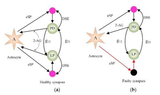 For the convenience of the following research, we used LP and PD neurons located in the crustacean pyloric CPG to distinguish two K-K neurons [31]. The fragment is used to illustrate the BiSRP-CPG model mediated by astrocytes, as presented in Figure 2. This fragment includes an astrocyte (A) and a minimal CPG coupled with two K-K neurons. Each neuron is connected via chemical inhibitory synapses. To demonstrate the self-repairing mechanism, two different network cases were designed. Figure 2a shows a healthy network. Under the stimulation of external synaptic inputs, 2-AG signals are released from LP and PD neurons, generating the DSE and eSP signals via direct and indirect feedback pathways. The balance of these two signals achieves a stable state for the transmission PR. Figure 2b shows a faulty network, where faults occur at partial synapses associated with neuron LP. Consequently, the balance between the DSE and eSP of the LP neuron is disrupted, resulting in an imbalance of PR at the synapses. However, when synapses are broken, the astrocyte can increase the PR value of other healthy synapses connected with neuron LP through indirect feedback, so that the PR value can return to a stable state.