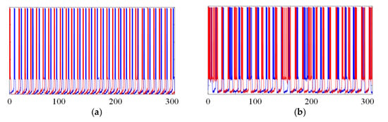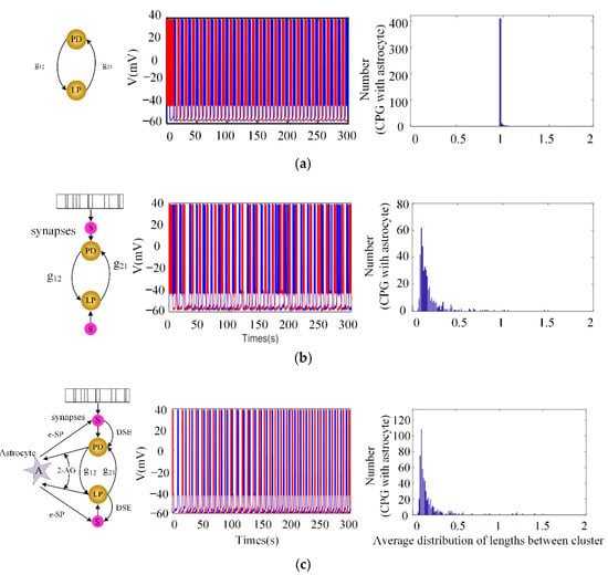 In this section, how astrocytes enhance the stability of the CPG network is demonstrated. Figure 3 shows the CPG model fragments in the case of different states, including the original ideal minimum CPG neuron network without external stimulation (see Figure 3a), the minimal CPG network without astrocytes under external random stimulation (see Figure 3b), and the BiSRP-CPG network with external random stimulation (see Figure 3c). Moreover, the time series of the membrane potential corresponding to different frame diagrams are also given in Figure 3. The red parts represent neuron LP and the blue parts represent neuron PD. The bursting activities of the CPG were studied via comparison of the membrane potential time series.