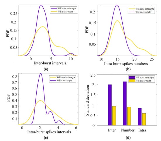 Probability density function and variance statistics of the output of CPG with or without astrocytes. (a) The probability density function of the inter-burst intervals; (b) The probability density function of the intra-burst spikes numbers; (c) The probability density function of the intra-burst spikes intervals; (d) Variance statistics of the inter-burst intervals, the intra-burst spikes numbers, and the intra-burst spikes intervals.