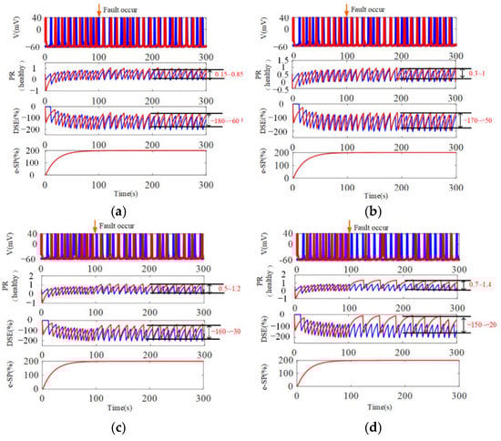 The dynamic behaviors of synapses connected with the CPG neurons when the neuron LP encountered synaptic failure at 100 s. The red parts indicate the neuron LP, and the blue parts indicate the neuron PD with no fault. The fault densities include (a) 20%, (b) 30%, (c) 40%, and (d) 50%. Each figure includes the member potentials of the astrocyte-mediated BiSRP-CPG, the PR of healthy synapses connected to neuron LP and neuron PD, DSE signal, and eSP signal.