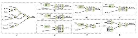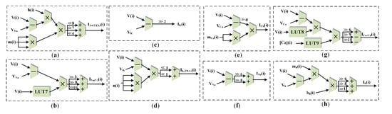 The function of the neuron model variable pipeline calculation structure is to calculate and update the value of the neuron membrane potential. According to the K-K neuron model, currents being injected by the synapses causes the change of membrane potentials and generates action potentials. Eight conductance-based ionic currents in K-K neurons and currents injected by synapses were utilized as input signals, which came from the ionic current pipeline calculation structure and the synaptic structure, respectively. The continuous differential equation was discretized using the Euler method. Note that a reasonable time step can reduce the error caused by the discretization and improve the simulation accuracy; hence, the time step in this article was set as ∆t = 0.00005 s. As shown in Figure 8, the current values of the membrane potential (V) and the other seven variables (h, m, n, hb, mb, mCa, and [Ca2+]) were calculated through eight pipelines. Each pipeline was set up with a dedicated buffer to store the variable value in the corresponding variable register block. These variables were buffered and input to other pipelines for the next iteration at each time step. If the membrane potential is greater than the threshold Vth, a spike will be generated. In addition, all pipelines require only a small number of multipliers, which greatly saves hardware resource consumption. Taking the h variable pipeline in Figure 8b as an example, the exponential decay of the membrane potential V at time i can be calculated using a look-up table (LUT). Traditional methods multiply the result directly by a scaling factor. However, we rewrote the scale factor 0.01 in the multiplication operation as 1/(26 + 25 + 22) to realize the multiplier-free neural variable operation.