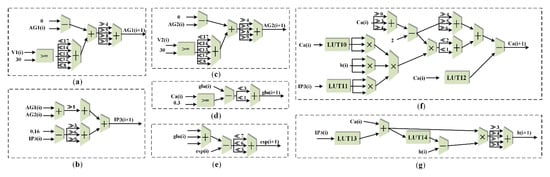 Figure 10 shows the tripartite synapse variable pipeline calculation structure, which implements the direct and indirect feedback pathways in tripartite synapses. When the spike train generated by the random number generator reaches the pipeline, the LP and PD neurons respectively update AG (see Figure 10a,c). Under the stimulation of 2-AG, astrocytes produce IP3 (see Figure 10b). Subsequently, calcium ions are released through three channels: Jchan, Jpump, and Jleak (see Figure 10f). The input signals of the calcium ion pipeline are related to Ca2+, h, and IP3 stored in the corresponding variable registers. Similarly, the values of Glu and eSP are calculated and updated in the pipeline shown in Figure 10d,e.