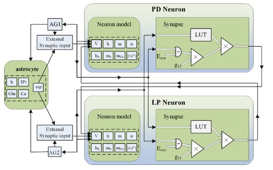 The overall hardware structure of BiSRP-CPG based on FPGA is shown in Figure 11. The whole system consists of a CPG module and an astrocyte module. The CPG module contains a pair of K-K neurons connected to each other through inhibitory synapses. Each neuron maintains a set of neural variables that update membrane potentials in real time. The astrocyte module receives AG signals from CPG modules and generates eSP signals to carry out indirect feedback. In this paper, the self-repairing of CPG networks by astrocytes is implemented through hardware circuits. The repair of this CPG network can be analyzed by setting different failure rates of the external synapses.