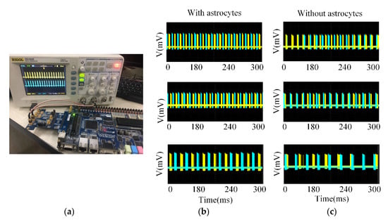 Figure 12a shows the FPGA hardware system platform. Figure 12b,c shows the CPG output waveforms under the fault condition mentioned in Section 4 (i.e., only the LP neuron encounters synaptic loss at different failure rates), in which the discharge behaviors of the BiSRP-CPG network under different synaptic failure rates are compared with that of original CPG network. The results show that the CPG output waveforms at different synaptic failure rates are consistent with the software simulation results. It can be demonstrated that when random synapses and fault synapses are introduced, BiSRP-CPG networks are more robust and self-repairing compared to the state without astrocytes.