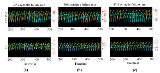 PR values and DSE signals at different failure rates, respectively: (a) 20% synaptic failure rate; (b) 30% synaptic failure rate; (c) 40% synaptic failure rate.