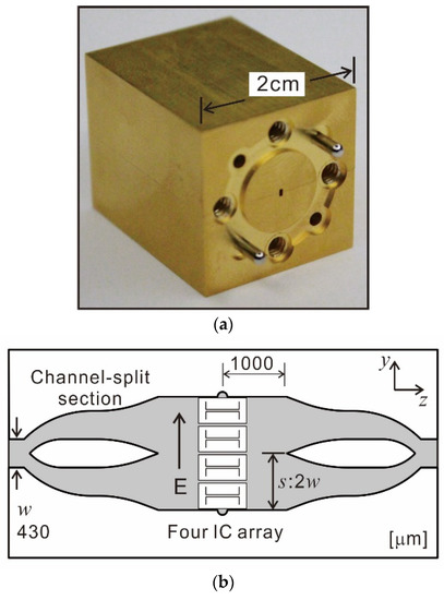 A sketch and photograph of the terahertz waveguide module containing a linear array of four IC chip elements are shown in Figure 1. Waveguide machining becomes very challenging when the frequency reaches the WR-3.4 band; the standard waveguide E-plane width (w) is only 430 mm because the size of available milling tools is only 200 mm. This forces the waveguide machining tolerance to exceed 20 mm. For the channel-split section inside the module, the channel widths are continuously varied without sharp corners to achieve a minimum reflection loss over a wide frequency range. The narrowest channel width near the split junction is 215 mm, slightly larger than the size of the milling tool. In the final stage of the binary tree before the two channels are merged, a cosine taper is applied to increase the channel width (s) to 860 mm, the largest single-channel width that prevents the propagation of higher-order modes.