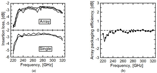 The array packaging efficiency calculated from the difference between single and array module’s average insertion losses is plotted in Figure 3b. It shows there are no significant additional losses for the entire frequency band for the array modules, except the small extra losses near 220 GHz and 270 GHz. These results imply that the amplifier gain will be preserved, whereas the output power will increase by a factor of the number of array elements when amplifier ICs are packaged instead of through-line ICs.