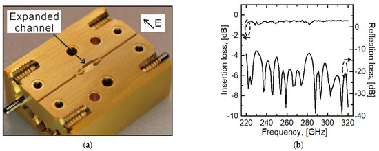 An empty module, shown in Figure 4a, with both the IC chips and the pedestal removed from the expanded E-plane channel was machined for the extra verification of a uniform field distribution across the 1720 mm wide channel. The measured insertion and reflection losses covering the full WR-3.4 band are plotted in Figure 4b. The average insertion loss was roughly 0.7 dB, and the mismatch loss stayed below −10 dB for the entire band. The flat insertion loss without large reflections indicated that the uniform-amplitude TE10 mode was well preserved in the expanded channel.