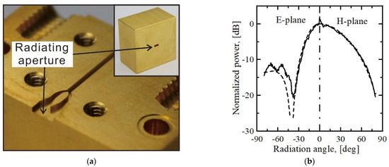 Another array module cut in the middle to form an open-end waveguide, as shown in Figure 5a, was additionally tested for radiation patterns, following the approach introduced in [5]. The expanded E-plane channel directly facing the free-space was an efficient radiator, working as an E-plane horn with a uniform phase. The measured reflection coefficient of the open-end block was less than −10 dB for the full band. The measured E-plane pattern at 270 GHz plotted in Figure 5b shows a half power beamwidth of 34 degrees and a side-lobe level of 12 to 14 dB, indicating a source aperture with a uniform amplitude and sharp edges. The pattern matched very closely to the normalized sinc function that represents the radiated pattern from a uniform-field source with an aperture size of 1720 mm. The measured H-plane pattern also matched well with a theoretical pattern obtained from the Fourier transform of a half-cycle cosine field variation across an 860 mm aperture which was multiplied by the obliquity factor of cosq for the radiating aperture placed on top of a metallic surface