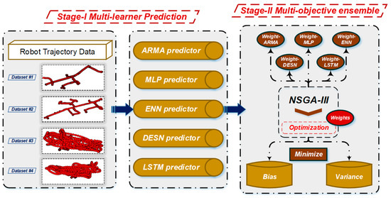 - The proposed multi-objective ensemble method is effective in improving the robot trajectory prediction accuracy of base learners. Its basic principle is to synchronously minimize the bias and variance of the model.