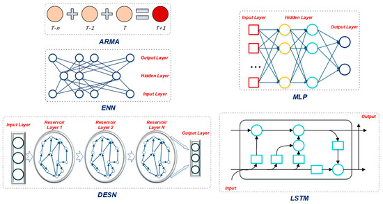 Structure of the ARMA, MLP, ENN, DESN, and LSTM models.