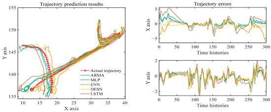 - Stage 1: multi-learner prediction. The trajectory dataset is divided into training and testing datasets. The trajectory is separated into several series in the orthogonal coordinate system. Fed with all orthogonal series, the ARMA, MLP, ENN, DESN, and LSTM are trained with the training dataset and generate forecasting results in the testing datasets.
