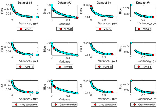 Applying the NSGA-III to generate the optimal ensemble weights, the prediction results of the proposed MMP model can be obtained. The Pareto optimal solutions obtained by different optimization methods are different, which leads to differences in the prediction errors of the models. The related evaluation metrics in Table 2 show the results of several methods for solving Pareto optimality, including VIKOR [48], TOPSIS [49], and Gray correlation [50]. In addition, Figure 8 shows the Pareto optimal results solved by the above methods. The bold numbers in Table 2 indicate the best solving method with the lowest prediction error among VIKOR, TOPSIS, and Gray correlation for datasets #1, 2, 3, and 4. The red points in Figure 8 represent the comprehensive optimal solution considering both bias and variance. It can be seen that there is no best strategy to select optimal ensemble weights. In datasets #1 and 2, the VIKOR generates the best performance. In dataset #3, the TOPSIS and Gray correlation select the same solution and both generate the best performance. In dataset #4, the Gray correlation generates the best performance.