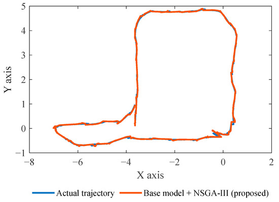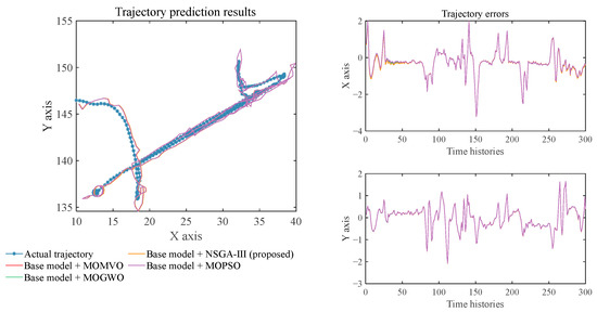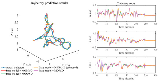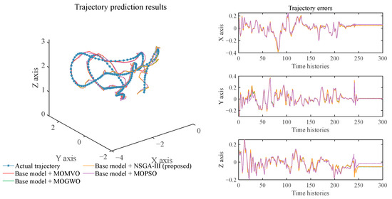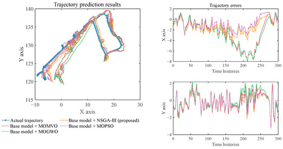- All multi-objective optimization algorithms are effective for ensemble prediction of robot trajectory. Comparing the prediction error metrics based on the optimization algorithms with the five base learners, it can be found that the prediction error is further reduced. Moreover, the trajectory prediction results based on the optimization algorithms are all close to the actual trajectory of the robot movement, and satisfactory prediction accuracy has been achieved. This demonstrates that the comparative experimental settings of the multi-objective ensemble models are effective, and each algorithm is set reasonably, which helps to fairly evaluate the effectiveness of the proposed model.