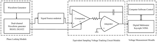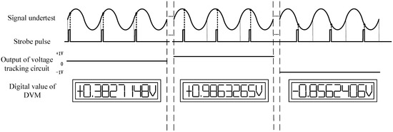 In the process of sampling digitization, the corresponding waveform of each signal is shown in Figure 3. The measurement process of the whole system is as follows: the waveform undertest is generated by the signal source undertest, and the strobe pulse is generated by the two-channel waveform generator in the phase locking module. The phase locking module completes the phase locking of the signal undertest and the strobe pulse through connecting and setting the instruments. The phase locking module is also able to adjust the phase difference between these two signals. Then, the equivalent sampling voltage tracking circuit transforms the amplitude of points on the waveform undertest whose phase is corresponding to the strobe signal into the equivalent DC level after several periods of measuring and comparing (the specific principle of transform will be detailed in Section 2.2.2). The digital multimeter measures the value of the DC signal and sends the data to the computer, at which point the measurement of one sampling point is completed. The phase of the strobe pulse is then adjusted to change the corresponding points on the waveform undertest, and the sampling values at different phase are measured. The above process is repeated until the measured values of all sampling points are obtained. These sampling values come from different periods of the signal, and the data are reconstructed in one period, that is, the equivalent sampling of the high-frequency periodic signal is completed.