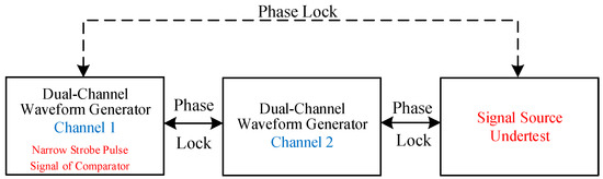 In order to ensure the complete period sampling and the corresponding relationship between the sampling value and the phase, it is necessary to lock the phase of the strobe pulse and the signal undertest. A waveform generator with a dual channel output is selected, both channels are set to “Burst” trigger mode, and the same external trigger is input to the two channels through another waveform generator so that the signals output from these two channels are synchronized. One of the channels generates a narrow pulse signal, which is output into the latch-enable terminal of the comparator as the strobe signal, and the other channel signal is output to the external-trigger terminal or phase-lock terminal of the signal source undertest to realize synchronization with the signal undertest. The relationship of three signals is shown in Figure 5. Then, phase locking of the strobe signal of comparator and the signal undertest is completed. At the same time, the phase difference of the above two signals can be adjusted by setting the start phase of the narrow pulse signal to “Burst” mode so as to realize the step of the sampling instant and the complete period equivalent sampling.