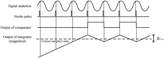 According to the measurement process and measurement principle described above, the correct sampled value will not necessarily equal the average value of the integrator output but may lie anywhere between the positive and negative limits as seen in Figure 7, thus, the maximum oscillation range of integrator output ∆Vmax represents the resolution of digitization of a certain point on the waveform and it is important to select a small enough value for ∆Vmax. However, if the value is too small, as the output slope decreases, it may take an intolerably long time for the comparator–integrator loop to acquire a full scale step change. After fully balancing the measurement precision and measurement time, the maximum allowable error ∆Vmax is set to 50 microvolts in this paper, which means the resolution of digitization of the system is 50 microvolts. If the frequency of the strobe signal is selected as 1 MHz, the relationship of the output slope and ∆Vmax is as follows: