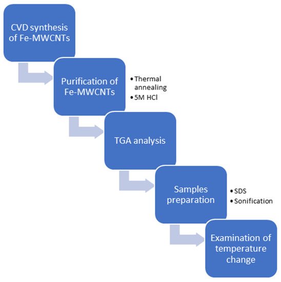 The research involved several stages. Firstly, the material was produced using an electrothermal method, then the material was purified and prepared for further testing. The material was then characterized and its iron content examined using thermogravimetric analysis. The next stage was the samples’ preparation for temperature rise studies. The process diagram is shown in Figure 1.
