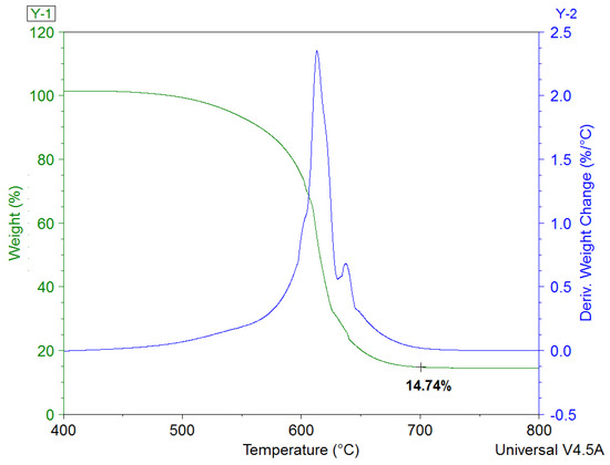 These CNTs were purified thermally and chemically with a 5M solution of hydrogen chloride in order to remove the catalyst residues and amorphous carbon-based impurities. The iron content when examined was around 15% (Figure 2). The content was measured using thermogravimetric analysis (TGA) and then the remaining material was examined on the SEM-EDS examination. The result of TGA analysis shows also that fabricated CNTs were mostly multi-walled CNTs. Obtained material was also examined with XRD. According to the results, the iron content of CNTs consisted of α-Fe and γ-Fe phases. The presence of the α-Fe and γ-Fe phases was revealed by the observation diffraction peaks corresponding to the 111 reflection of γ-Fe and to the 110 reflection of α-Fe, respectively. The iron content was estimated to be 68% of the γ-Fe phase and 32% of the α-Fe phase. Fe3C was not observed in the samples.
