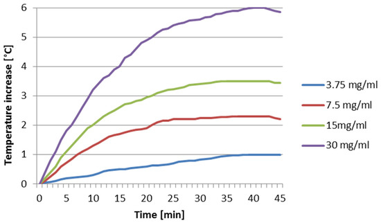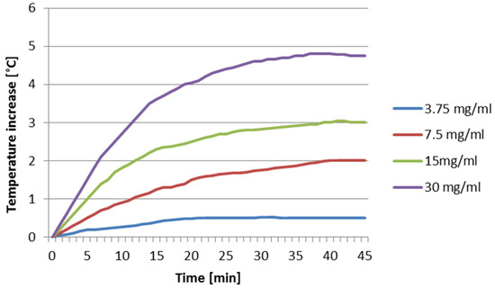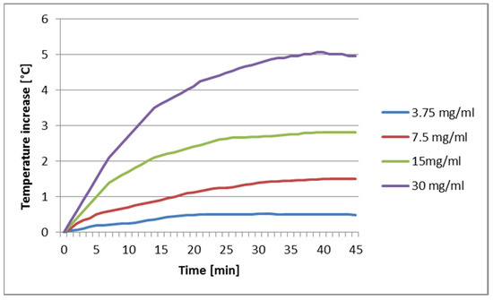 The observation drawn from the plots is that the tendency of temperature change was directly proportional to the concentration. With the increasing concentration, the temperature change also rises. It is clearly visible that it occurs respectively, as could be expected. Samples in the concentration of 3.75 mg/mL gain a temperature rise of only 0.5 °C. In the case of 7.5 mg/mL, the temperature change is higher and equals 1.5 °C. For 15 mg/mL, it was almost 3 °C and for the highest concentration of 30 mg/mL, the change was equal to approximately 5 °C.