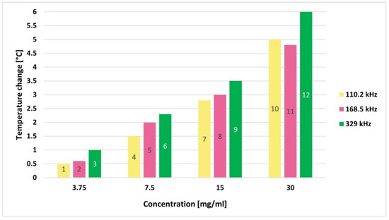 The same as at the frequency of 110.2 kHz, a higher concentration proved to gain a higher temperature. The heating of the sample in the concentration of 3.75 mg/mL did not result in almost any higher temperature, its temperature again rose by only a half-degree Celsius. For the sample of 7.5 mg/mL, the temperature was equal to around 2 °C. In the case of 15 mg/mL, it was around 3 °C. For the highest concentration of 30 mg/mL, the temperature rise was around 4.8 °C. The sample with the highest concentration also had a relatively quick change during the first 25 min. The same situation occurred for the concentration of 15 mg/mL, but for a shorter time period of 15 min.