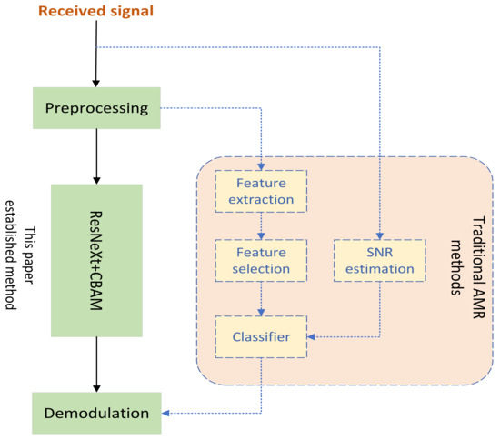 AMR is an intermediate process that occurs between signal detection and receiver demodulation. Compared with the traditional method, the structure of the proposed AMR method in this paper is shown in Figure 1. The preprocessing in Figure 1 refers to the sampling and quantization of the IF signal. The traditional AMR process, as shown in the dashed box, contains the extraction, selection, and classifier of expert features, which is replaced by the CNN method in this paper. Moreover, provided that the SNR range of the communication channel is known, CNN can learn the characteristics adapted to the corresponding conditions. This property means that the method proposed is unrelated to SNR estimation.