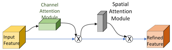 A convolutional block attention module (CBAM) is an attention module that can be inserted into convolutional neural networks. A CBAM will infer the attention map along two independent dimensions (channel and spatial) accordingly, and then multiply the attention map with the input feature map to perform adaptive feature optimization. As shown in Figure 3, the output result of the convolution layer is first weighted by the channel attention module, and then passed through the spatial attention module to obtain the final result.