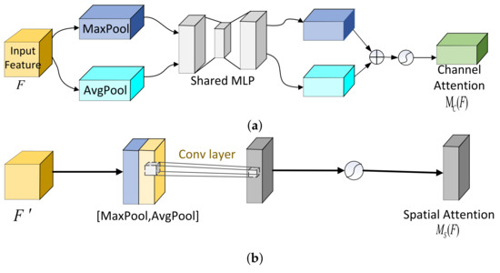 The channel attention module, as shown in Figure 4a, compresses the feature map in the spatial dimension and then operates after obtaining a one-dimensional vector. The input feature maps are compressed by the MaxPooling layer and the MeanPooling layer, and then sent to the shared fully connected layer. Then the results of the shared fully connected layer are summed and activated by the activation function sigmoid to obtain the final channel attention weights , which can be expressed in Equation (5).