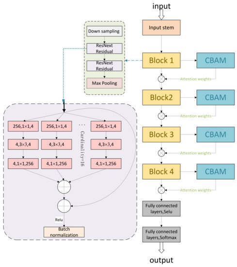 Figure 6 shows the network structure designed for automatic feature extraction of 10 types of modulated signals. Based on ResNext, the CBAM module is introduced and connected after each convolutional block of ResNext. It consists of four convolutional modules and two fully connected layers, where each convolutional block consists of a down-sampling layer and two ResNext residual blocks, and a MaxPooling layer. In each ResNext residual block, to avoid the gradient disappearance and slow network convergence caused by the internal covariate shift during the training process, it is necessary to batch normalize the activation values at the end. The original radio signal first enters the convolution module through the input layer, and the convolution module inputs the extracted features to the attention layer, weights the features in the attention layer, and finally inputs to the next layer after the cascade processing of nodes. The final features are fed to fully connected layers for subsequent classification. The first fully connected layer uses the Selu scaling exponential linear unit activation function, and the second fully connected layer uses the Softmax activation function with an output size of 10.