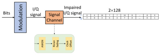 The establishment of the dataset is shown in Figure 7. Bits are modulated and passed through the channel, including AWGN, Rician fading and clock offset, to synthesize 10 types of transmission-impaired IQ signals under various SNRs.To generate well-characterized data sets, ten widely used modulations are selected: eight digital modulations and two analog modulations. These include 8-PSK, BPSK, CPFSK, GFSK, 4-PAM, 16-QAM, 64-QAM, QPSK for digital modulation, and WB-FM and AM-DSB for analog modulation.