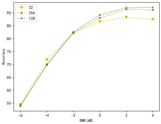 The dataset parameters are also set as close as possible to the realistically complex electromagnetic environment. The sampling frequency affects the classification performance only in the fading channel, and the Rician channel is modeled as a flat channel when = 200 kHz. In the flat channel, the multipath structure of the channel allows the spectral characteristics of the transmitted signal to be preserved on the receiver side. Taking into account that the length of the signal sequence may have an impact on the results, the model shown in Figure 6 is used to train on datasets with sequence lengths of 32, 128, and 256, respectively. The over-sampling rate is 4. Other signal parameters are set as follows: the SNR range is [−6, 4], and the step size is 2 dB. The center frequencies of digital and analog modulation types are 902 MHz and 100 MHz, respectively. A total of 10,000 data points are generated for each modulation type at each SNR, of which 80% are used for training, 10% for validation, and 10% for testing. Figure 8 shows the effect of different sequence lengths on the recognition results, so the dataset with sequence length L = 128 was chosen as the input to the modulation recognition model.