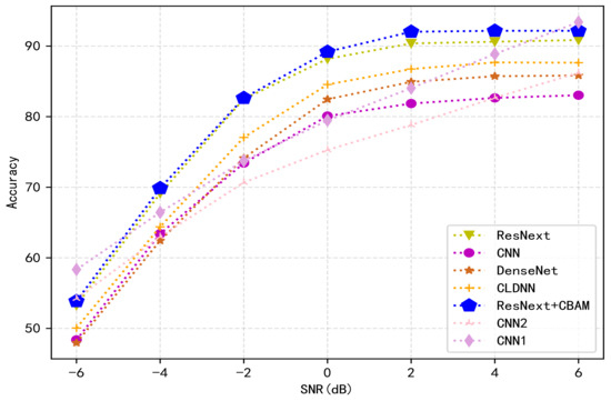 From the comparative performance plots of various neural networks given in Figure 9, it is clear that the recognition accuracy of all five networks increased with increase in SNR due to there being less noise at high SNR. Under high SNR, ResNext + CBAM and ResNext were able to achieve more than 90% recognition accuracy, which was the best result among all models, due to the residual connection method and the topology of ResNext’s group convolution. The ResNext model, with introduction of a CBAM attention layer, was about 3% higher than the ordinary ResNext model, reflecting the benefit of introducing a CBAM attention mechanism, which can help to extract effective features from noise-contaminated data.