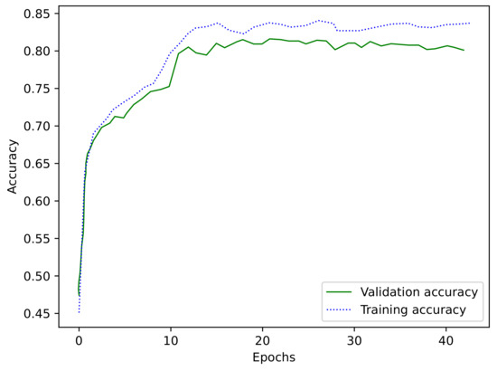 The variation in the training accuracy function (dashed line) and the validation accuracy function with the number of iterations is shown in Figure 10. It can be seen that as the number of training iterations increases, the values of both the training accuracy function and the validation accuracy function increase and finally reach a stable value at 40 iterations.