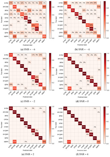 The confusion matrix tested at SNRs ranging from −6 dB to 4 dB with a step size of 2 dB is shown in Figure 11; the numbers in the percentage column indicate the percentage of the left signal type that were a misrecognition of the right signal type. Figure 11a shows that SNR = −6 dB and OA = 54.86%. Figure 11b shows that SNR = −4 dB and OA = 69.87%. Figure 11c shows that SNR = −2 dB and OA = 82.95%. Figure 11d shows that SNR = 0 dB and OA = 89.19%. Figure 11e shows that SNR = 2 dB and OA = 92.78%. Figure 11f shows that SNR = 4 dB and OA = 92.17%. It can be seen that the established model can accurately identify most signal types, while for AM-DSB and WBFM, 16-QAM and 64-QAM have poor recognition results. This is because, when the data set is generated, the observation window is small, the information rate is low, and the correlation between the information is small, so it is difficult to distinguish AM-DSB and WBFM. For 16-QAM and 64-QAM, due to the amplitude characteristics and phase information of the QAM signal, the I/Q signals of these two signals are similar, and it is difficult to classify and recognize them.