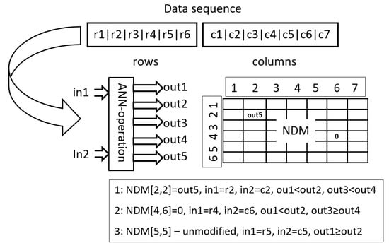 Applying ANN operations in Oper1: ANN operation is run for each item in NDM, one after another, and it can change the value of each item. The figure shows applying the network to determine the value of three items: NDM[2,2], NDM[4,6] and NDM[5,5]. In the first case, the item is modified to the value , which is the response of the network to the input . are data items that correspond to the second row and column, that is, to the location of the modified item. The value is inserted into NDM because and . In the second case, the item receives the value 0 because and . In addition, in the third case, the item is left unchanged because .