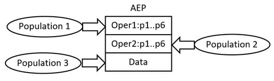 The common characteristic of all AE-based algorithms is the use of cooperative co-evolutionary GA (CCEGA) [,] to evolve AEPs, that is, to determine the number of operations (AE,AEEO), the type of each operation (AE), the parameters of the operations (all algorithms), the length of the data sequence (AE,AEEO), and its content (all algorithms). As already mentioned, the implementations of operations are predefined. According to CCEGA, each evolved component of AEP evolves in a separate population, that is, an AEP with n operations and the sequence of data evolves in populations (see Figure 2) [].