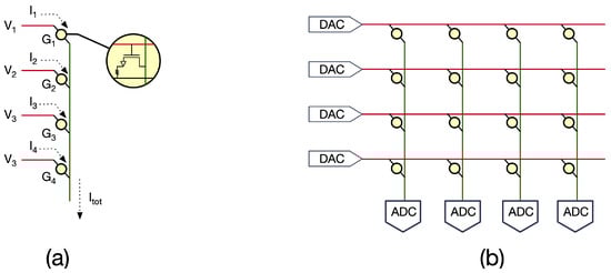 where the notation is the conductance value (i.e., the reciprocal of resistance ), which represents the weight, is the voltage, which represents the input value. Thus, current I represents the result of input V multiplies with weight G. Then, the accumulated current of each column in a ReRAM array can be expressed as Equation (3):