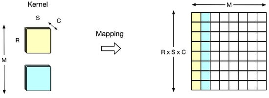 Because there are lots of computing operations in a convolution, an efficient dataflow is required. Here, we address how to map data to CIM architecture to complete a convolution computation efficiently. For an input feature map, as shown in Figure 1, we need to perform the following convolution computation: input data with dimension , kernel with dimension , and output with dimension . Due to the limit of CIM architecture, in general, we store to a column and each column store different kernel M, where R represents kernel height, S represents kernel width, C represents channels and M represents different kernels like Figure 3. In a convolution, when weights multiply with input activations, they need to be added together. This is the same as the property of CIM architecture in which the current will be accumulated in a column and produce total accumulated current at the bottom of the column as result. Thus, we can also treat a column as a convolution computing of each output pixel. These weights will be stored in the ReRAM memory until all input activations that need to process are completed. Then, the system will store other new weights and do a convolution process again until the whole convolution finishes.