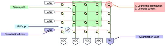 ReRAM-based DNN accelerators have been proved to be the best solution [,]. Note that ReRAM has small Read and Write latency. In addition, ReRAM cells are small and can store multiple levels. While the electrical properties and crossover structures of ReRAM enable energy-efficient DNN computing, the physical properties (non-linear factors) also make ReRAM-based DNN accelerators prone to errors. When performing a MVM computation in a ReRAM crossbar array, multiple word lines are activated simultaneously and the currents flowing through different cells in the same bit line are accumulated to obtain the sum of the products. Even if none of the cells in the same bitline are in error, the result of sum-of-products for the sense amplifier readout may still be incorrect [], mainly due to the error accumulated from each activate cell in the same bitline and the resolution limited by ADC. Additionally, some previous works [,] studied the memory reliability problem. Since many factors affect the reliability of ReRAM-based DNN accelerators, to accurately evaluate DNN model performance at the early design stage, a simulation platform is required to estimate the impact of non-linear factors and hardware limitations on the inference accuracy of the target neural network.
