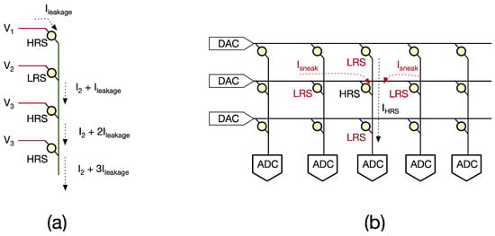 ReRAM cell use conducting filament to conduct memory. In general, A ReRAM cell has at least two states, which are HRS (high resistance state) and LRS (low resistance). HRS represents logic zero and LRS represents logic one. In HRS state, in theory, there is no current passing the ReRAM cell. However, like Figure 6a, in practice, HRS state still has little current. Such a current will be accumulated in a ReRAM array. If the amount of the leakage current (i.e., the current that should not exist) is close to or large than the amount of current from LRS, the output will produce an error. This problem gets worse in two situations: small On/Off ratio and large array size. On/Off ratio is defined as . If On/Off ratio is small, the total accumulated leakage current of in the array can approach very soon. On the other hand, if the memory size is large, the total leakage current of is also possibly approaching . Thus, we should not treat the current in HRS of ReRAM cell as a zero value. The behavior of leakage current can be express as Equation (5):