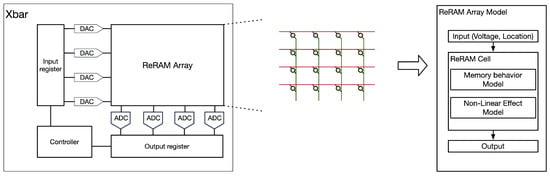 In Figure 7, a ReRAM array model includes inputs (converted values from DAC) and ReRAM cell locations in a ReRAM array. A ReRAM cell includes ReRAM memory behavior model and non-linear effects. Since input voltage and cell behavior vary with cell’s location in a ReRAM array, the ReRAM cell model utilizes input value and location as input to determine its behavior and non-linear effect. After that, the result will transfer to ADC to convert back to a digital value.