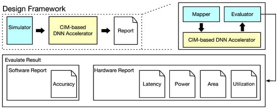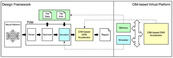 The overview of the proposed design framework is displayed in Figure 9. Since the CIM-based virtual platform is embedded into the design flow, for explanation, we use colors and dotted lines to connect both the virtual platform and the whole design framework. The proposed design framework includes a compiler TVM, which is a modern open-source compiler for DNN accelerator, and a CIM-based virtual platform. Our framework takes a model as the input and outputs a report that includes accuracy, hardware cost, and performance evaluation.