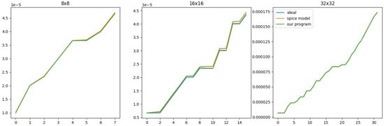 First, we use Spice model to validate the consistency of ReRAM behavior with our program. Based on the values of parameters listed in Table 2, we use the Spice model in [] and simulate with Hspice tool. In the experiment, we build a ReRAM array and randomly generate different input patterns to observe the accumulate current. In Figure 11, we display the results of the ideal case, the spice model and our program with respect to , , array sizes. In the ideal case, we assume a ReRAM cell in HRS state has no current throw through it. In our program, we calculate the leakage current with the noise model. As shown in Figure 11, we find our program has a very similar trend versus the spice model. It proves that our program can get a practical result. Note that the deviation between the ideal case and the spice model is small because the on/off ratio of ReRAM is big. Thus, in overall, the effect of leakage current is not obvious.