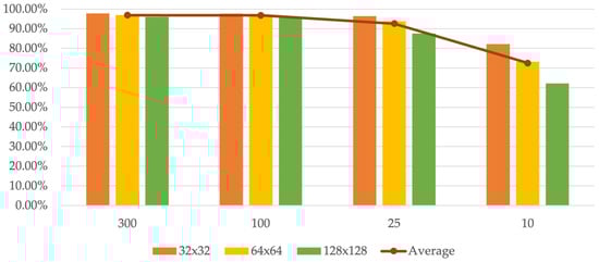 In Figure 13, we consider four kinds of On/Off ratio, including 300, 100, 25 and 10, respectively. Additionally, we consider , , and array sizes, respectively. We observe that high On/Off ratio can holdout error accumulation. As shown in Figure 13, the accuracy is almost the same when On/Off ratio is between 300 and 100. It means that On/Off ratio 100 is enough to distinguish the states. The accuracy starts to downgrade when On/Off ratio is 25. The accuracy drops worse when On/Off ratio decreases to 10. We can find that the average accuracy loses about 20% in the average line chart. Besides, we also find that a small array size accumulates little error. Thus, a small array size has a small impact on the accuracy loss. We can conclude that: if we want to use large array size, high On/Off ratio is necessary. If we have small XBar array size, we can try to use little XBar array to improve latency and power consumption. Large array size can improve throughput, but needs large On/Off ratio which introduces high latency and high power consumption. Small array size can use small On/Off ratio, but needs to compute more clock cycles. The designer cannot know which is the best architecture of DNN accelerator. It proves that a design framework is necessary to simulate and explore the best result.