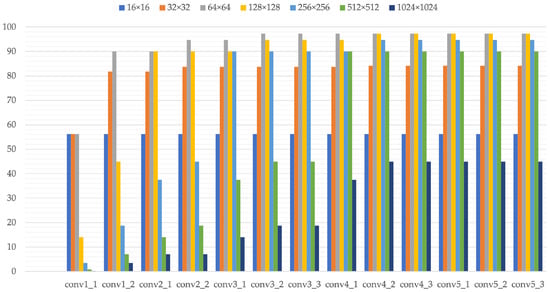 We use VGG-16 to study the utilization in different layers with respect to different array sizes. Note that VGG-16 has thirteen convolution layers and three fully connected layers. Because the bottleneck of performance occurs in convolution layers, here we focus on the utilization in convolution layers. In Figure 14, we evaluate the VGG16 model with an array size from to . Note that we assume there is only one XBar in the CIM-based DNN accelerator.