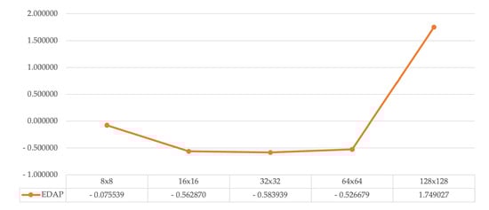 We use VGG-8 as an example to evaluate EDAP (energy delay area product) with respect to different array sizes. EDAP is the product of energy, delay and area. This is an indicator of hardware performance and cost. In Figure 15, we demonstrate the result of EDAP from XBar array size to XBar array size . In this experiment, we assume there is one XBar array in our CIM-based DNN accelerator. In addition, we normalize the results because the numbers after EDAP are difficult to read. Note that the lower number of energy, delay and area are better. Thus, we want to find an XBar array size with low EDAP.